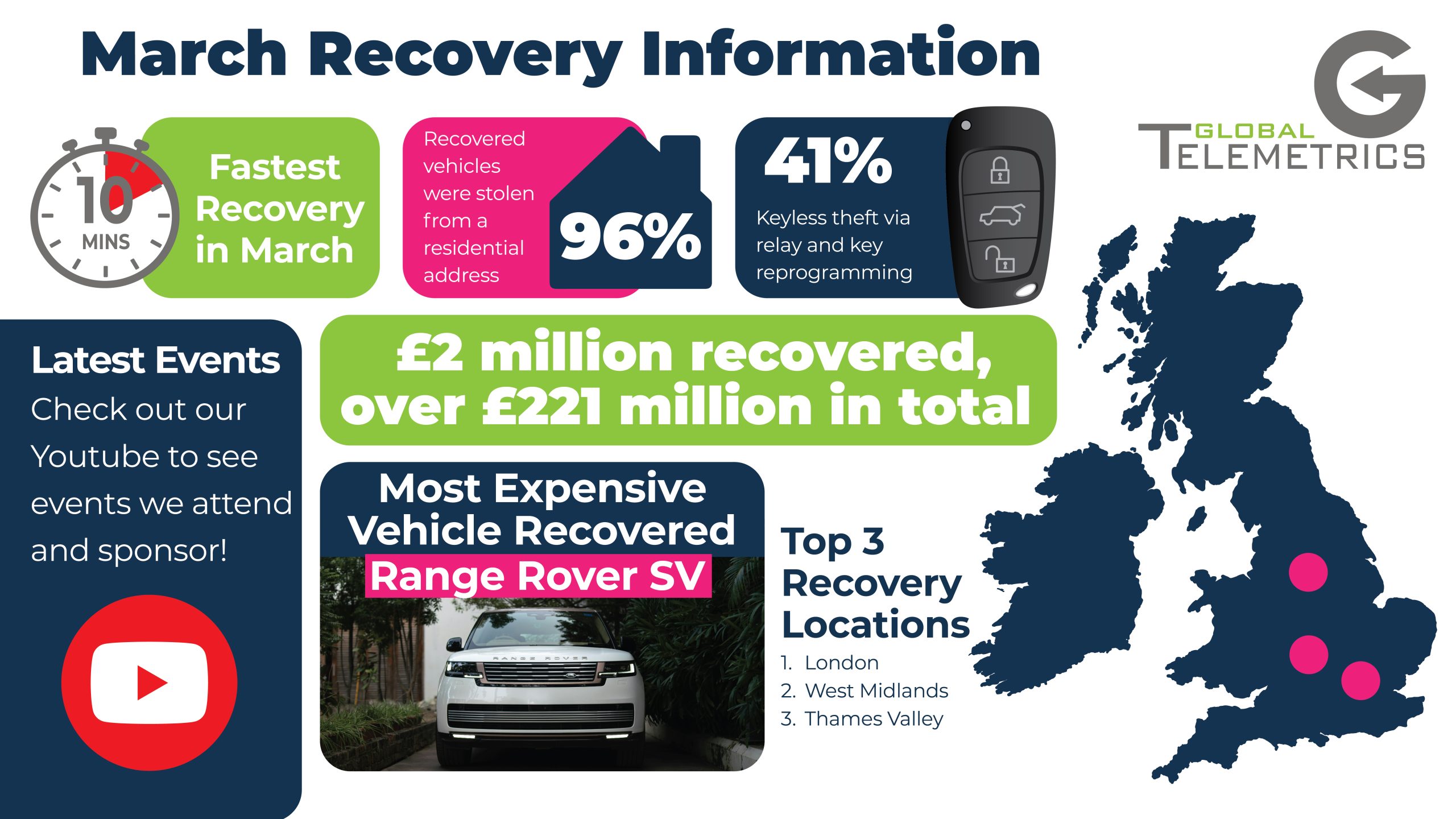 Global Telemetrics continue their own battle against car theft, recovering £2m worth of stolen vehicles throughout March, frustrating thieves’ efforts and contributing to an overall lifetime recovery total now exceeding £221m.